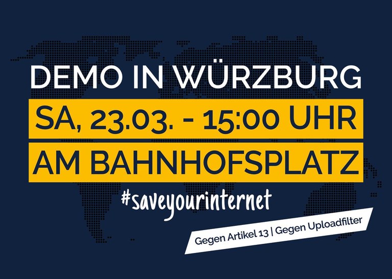 Am Samstag, den 23.03. findet eine Demo zum Thema #saveyourinternet statt. Diese richtet sich gegen die von der EU geplante Reform des Urheberrechts. Konkret stehen Artikel 11 bis 13 in der Kritik. Wir freuen uns auf eure Unterstützung. Start der Demonstration ist am Bahnhof Würzburg um 15:00 Uhr