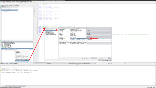 Now you are almost ready to generate the programming file but you have to change some configuration setting first right click on the „Generate Programming File“ header and choose „Process Properties“ and change „Unused IOB Pins“ (under the „Configuration Options“ Tab) to „Floating“: