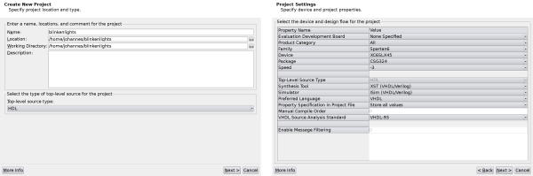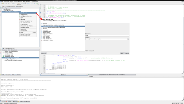 Now that you have installed and registered ISE (it will ask you to create a license file on first start) you can create a new Project. Select HDL as Top-level source type.