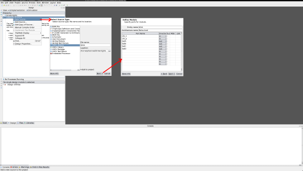 Right click on the xc6slx45-3csg324 folder and create a new file. Select „VHDL Module“ and give it a name. In the next window we define the inputs and outputs of the entity. You should define six ports there: