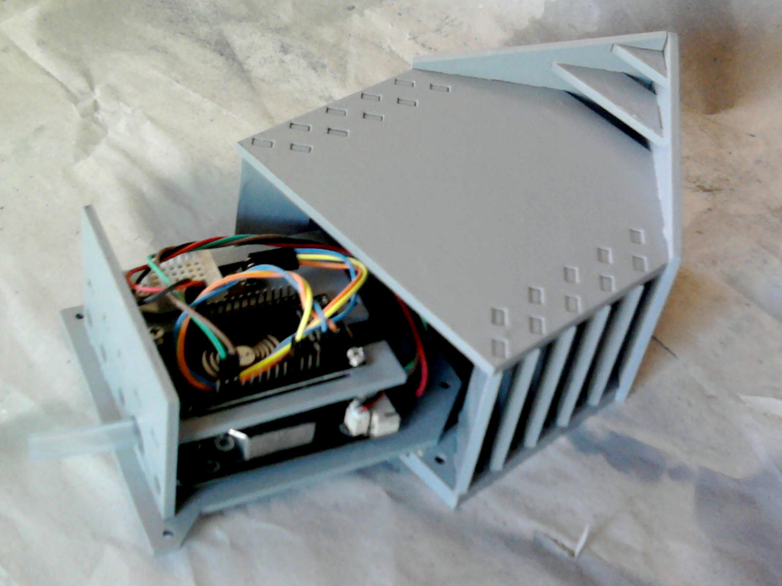 Hmm. Da muß noch 'was gehen. Auch zum (technischen) „Herzeigen“. Herausgekommen ist der Ansatz den Temperatursensor in einem eigenen Teilgehäuse unterzubringen. Vor Allem um damit das Meßergebnis für die Temperatur nicht durch die System-Abwärme zu sehr zu beeinflussen. Wir bevorzugen Acryl oder einem anderen geeigneten Kunststoff um der Problematik der Haltbarkeit weitestgehend zu entgehen. Wichtig ist nur für unsere Laser-Vorlage, daß das Material recht genau eine Stärke von drei Millimetern besitzt. Sonst heißt es: Nacharbeiten oder Vorlage anpassen.