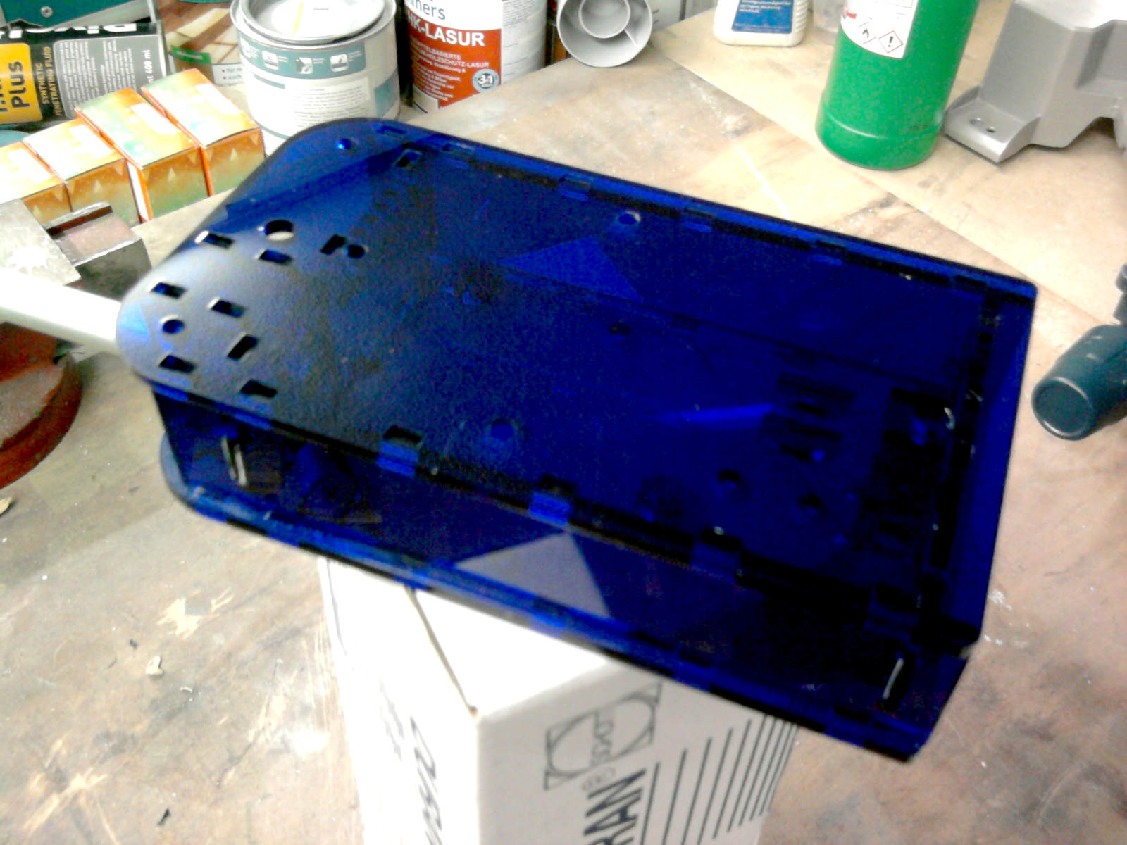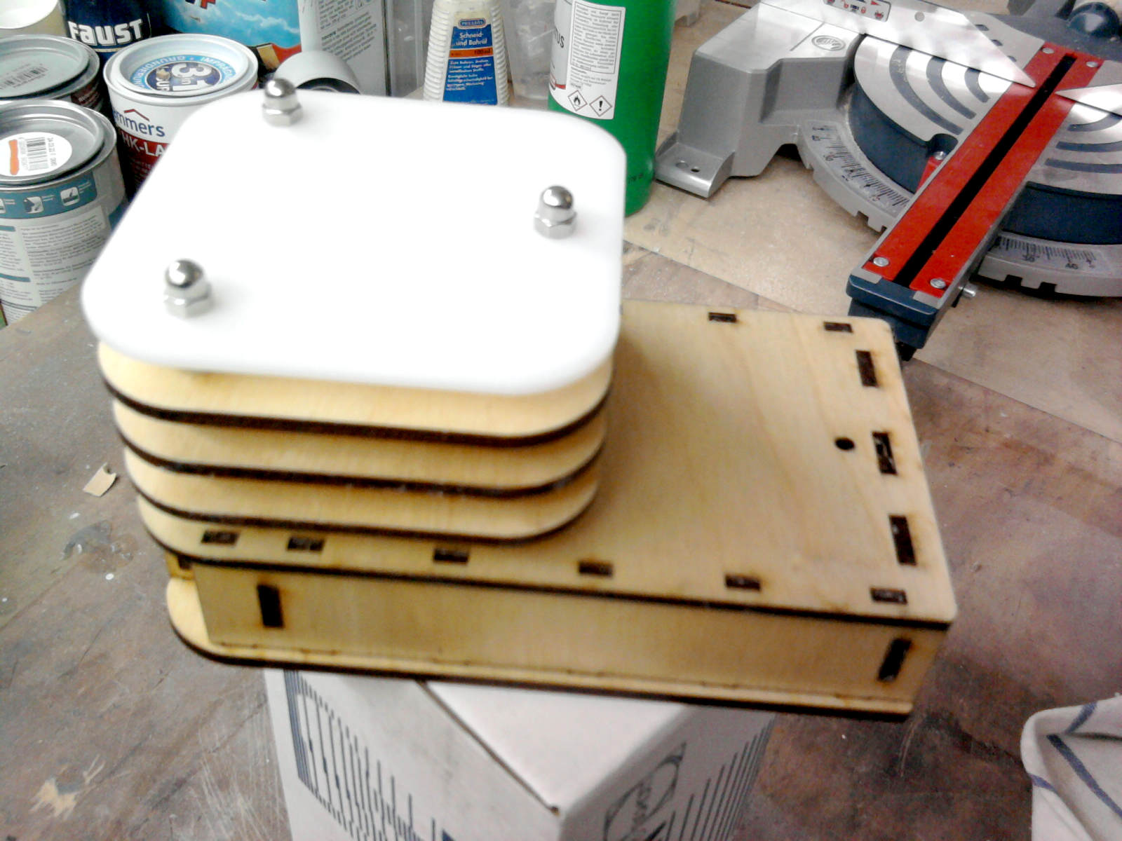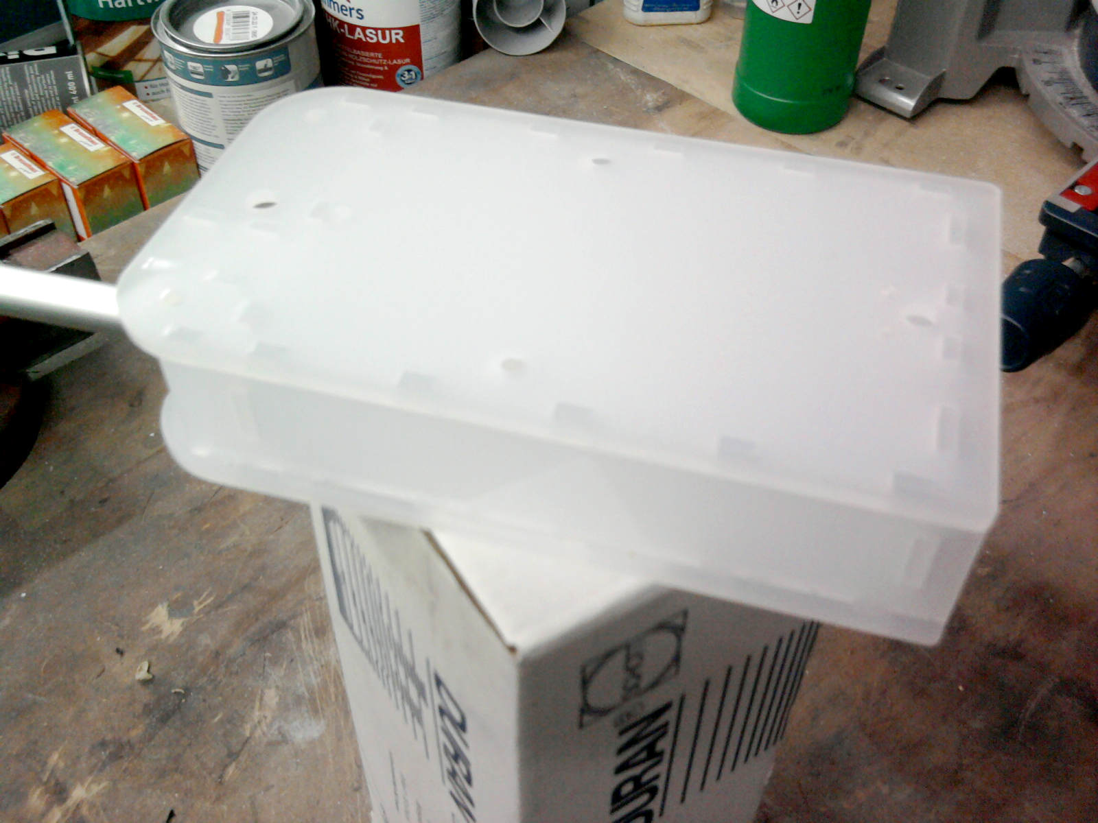 Der zweite Bauansatz, den wir gestartet hatten … Aus Holz ist es unbedingt erforderlich das Gehäuse zu lackieren. Wie lange das hält? Ehrlich: Wir haben damit keine Langzeiterfahrung. Aber für den Balkon in (teil-)geschützter Lage sollte das sicher gehen. Ob Lackiert, lasiert … der Fantasie sind da ja wenige Grenzen gesetzt. Hauptsache einigermaßen witterungsbeständig. Das Vogelhäuschen läßt sich natürlich auch aus Acryl fertigen (Bilder dazu folgen noch …).