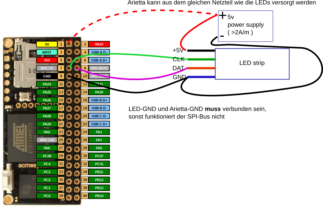 Die Verkablung ist recht einfach zu machen dabei ist aber sicherzustellen, dass Arietta-GND und LEDstreifen-GND verbunden sind da sich der SPI-Bus auf GND bezieht.