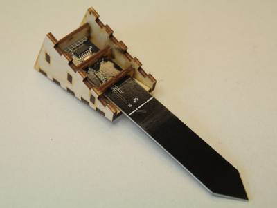 Der Sensor auf dem Bild ist schon teilweise in ein Holzgehäuse eingebaut.